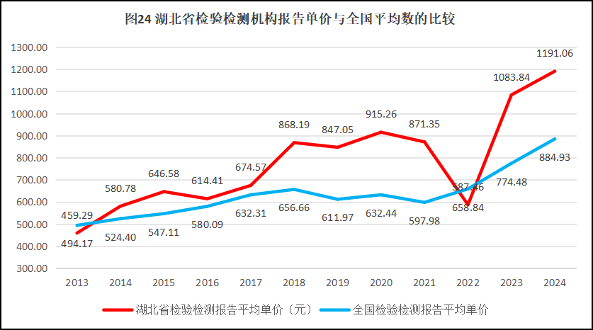 由图24可见,12年来,湖北省检验检测报告的单价总体保持增长,且除2013年和2022年之外一直比全国平均数要高。2024年,湖北省检验检测报告平均单价1191.06元,比全国平均数高了300多元。可见,湖北省检验检测机构虽然对外出具的检验检测报告总数量不大,但其报告单价较高,因此检验检测机构能够确保合理的利润,发展空间仍然较为宽广,市场环境比较健康。