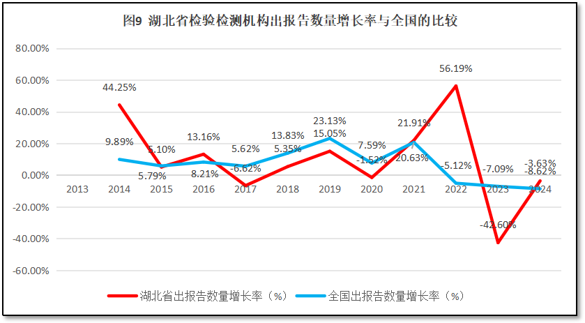 湖北省检验检测机构出具报告数量的增长率与全国检验检测机构出具报告增长率的比较,如图9所示。